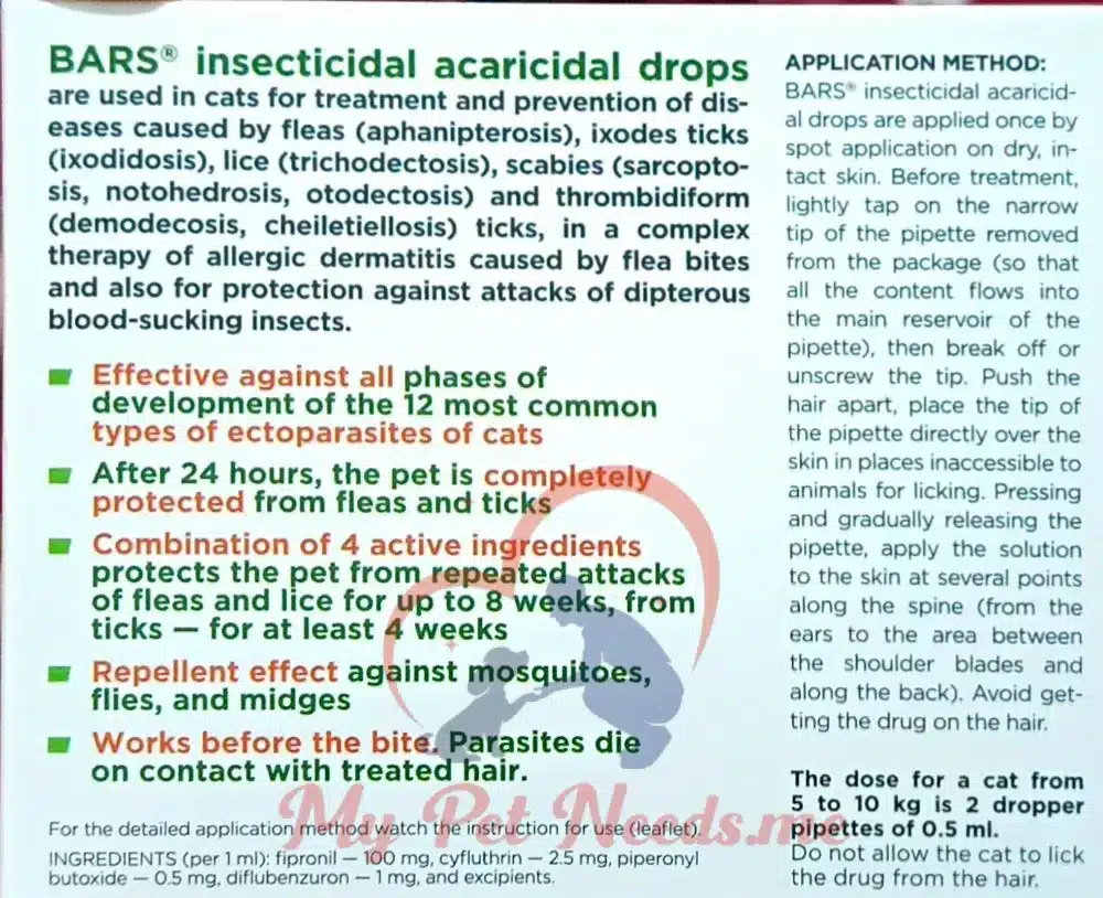 Bars Spot-On for Cats is a reliable veterinary treatment developed by AVZ to safeguard cats from external parasites including fleas, ticks, and lice. This convenient topical solution is applied directly to the skin and provides up to 4 weeks of continuous protection.