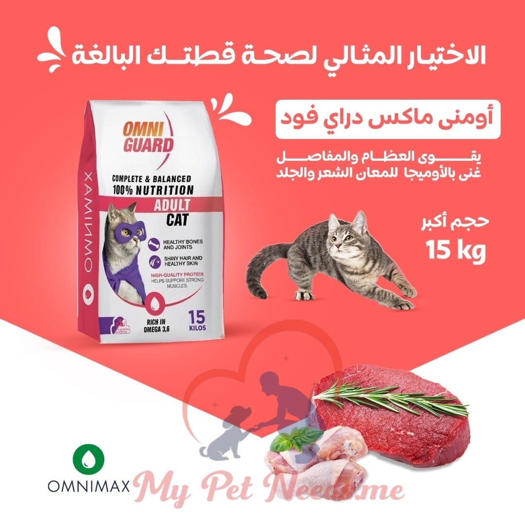 دراي فود للقطط من اومني جارد متوفر باوزان كيلو جرام و 15 كيلوجرام للقطط البالغة ، اكثر من ستة اشهر في العمر.