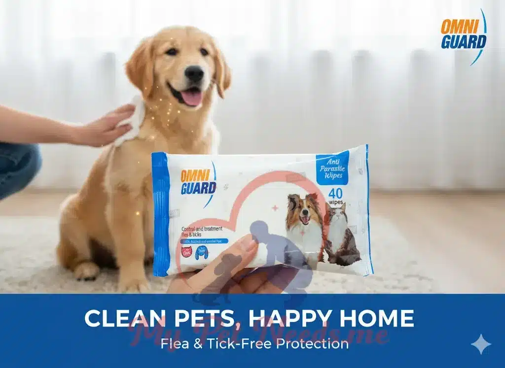 Omniguard Pet Wipes (40 count) come in three variants—Blue (Anti-fleas and mites), Green (Coat health and care), and Pink (eye care)—gentle, effective, and perfect for daily use.
